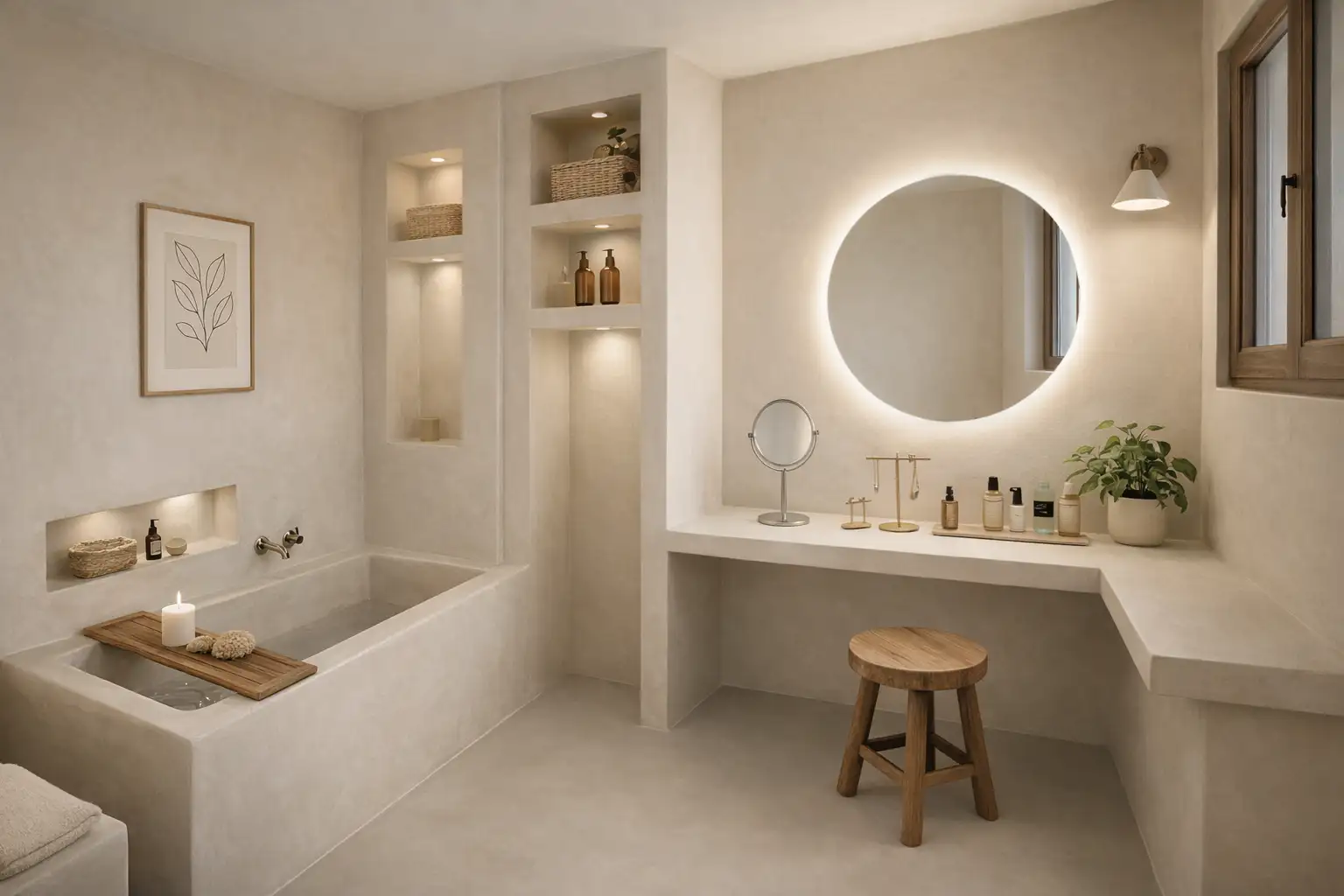 Cette salle de bain en Tadelakt à Bénac a été conçue pour offrir une atmosphère cocooning et épurée. Baignoire sculptée aux lignes arrondies, vasque inclinée avec caniveau doré et murs imperméables en chaux naturelle, pour un rendu intemporel et apaisant.