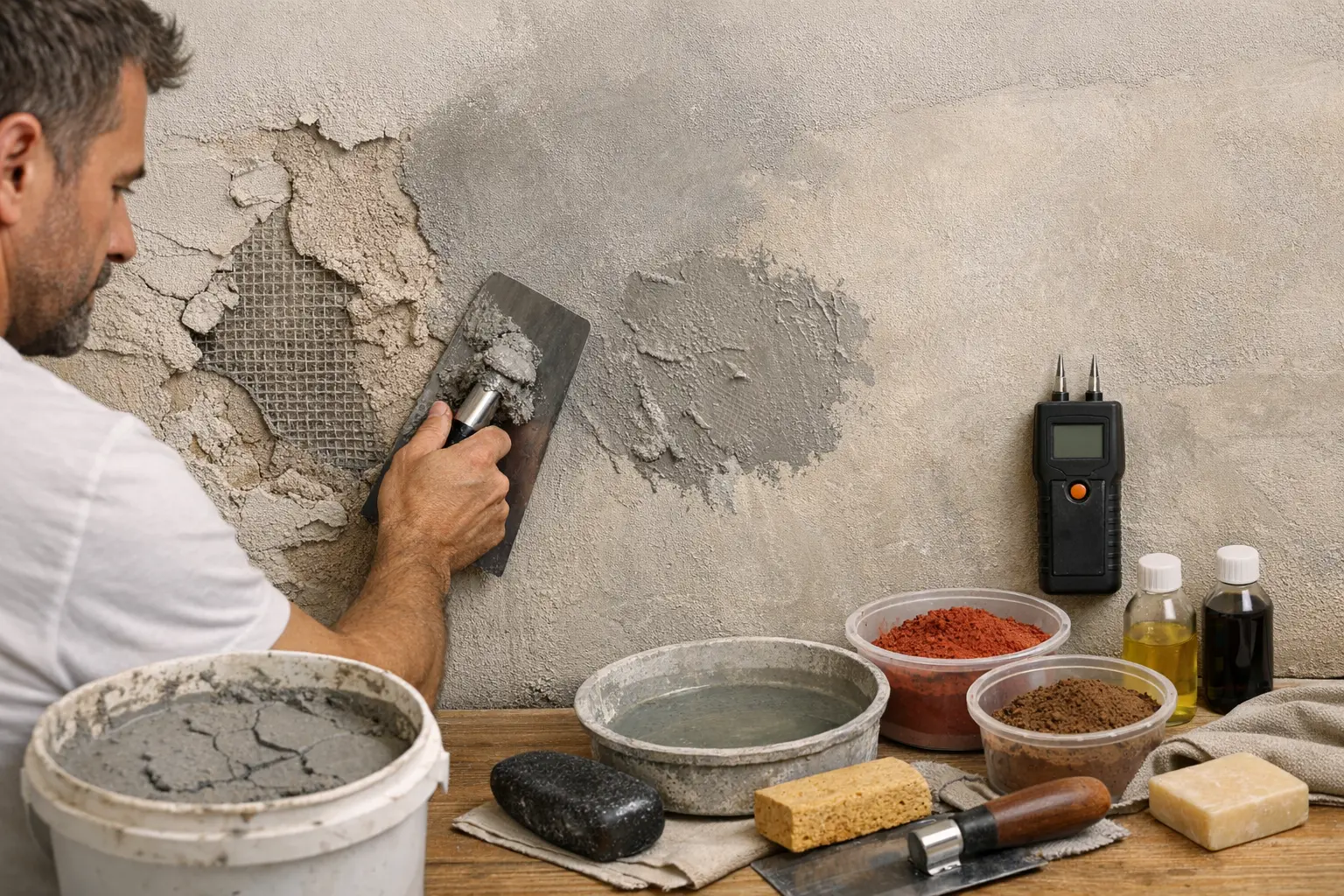Un dosage eau/chaux/poudre approximatif donne une pâte trop liquide qui coule, ou trop sèche qui accroche et marque à la taloche. Avec le Tadelakt, la cohérence doit rester crémeuse, sans grumeaux ni zones farineuses. Si la pâte se sépare, la chaux ne travaille pas correctement et le rendu devient hétérogène. Vous gagnez en régularité en pesant les composants et en ajoutant l’eau progressivement, plutôt qu’en corrigeant au dernier moment.