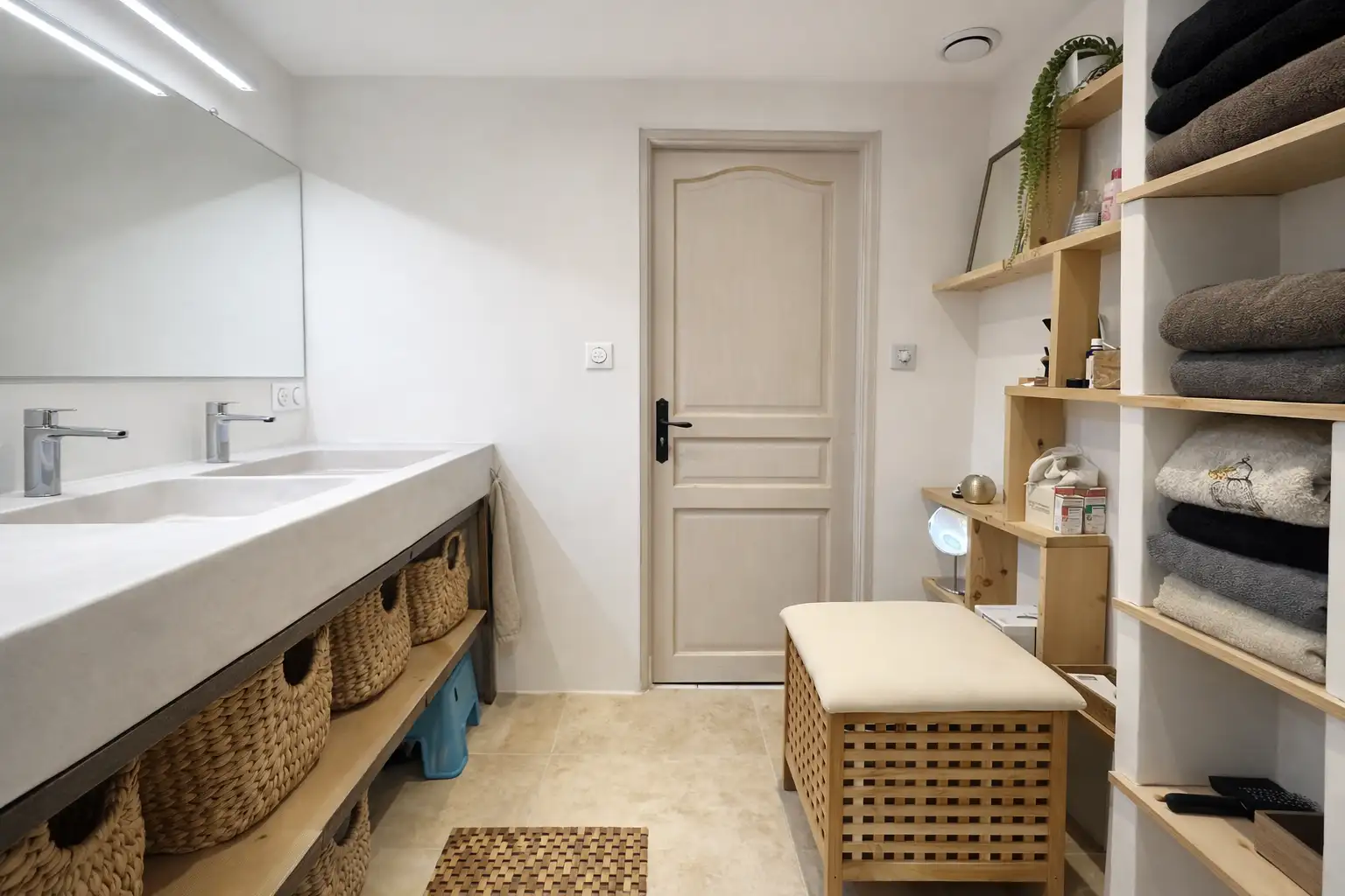 Découvrez la rénovation d’une salle de bain en Tadelakt près de Tarbes, réalisée avec un savoir-faire artisanal unique. Une double vasque sculptée, des étagères en bois de cèdre, et des murs imperméables polis au galet pour un espace élégant et fonctionnel.